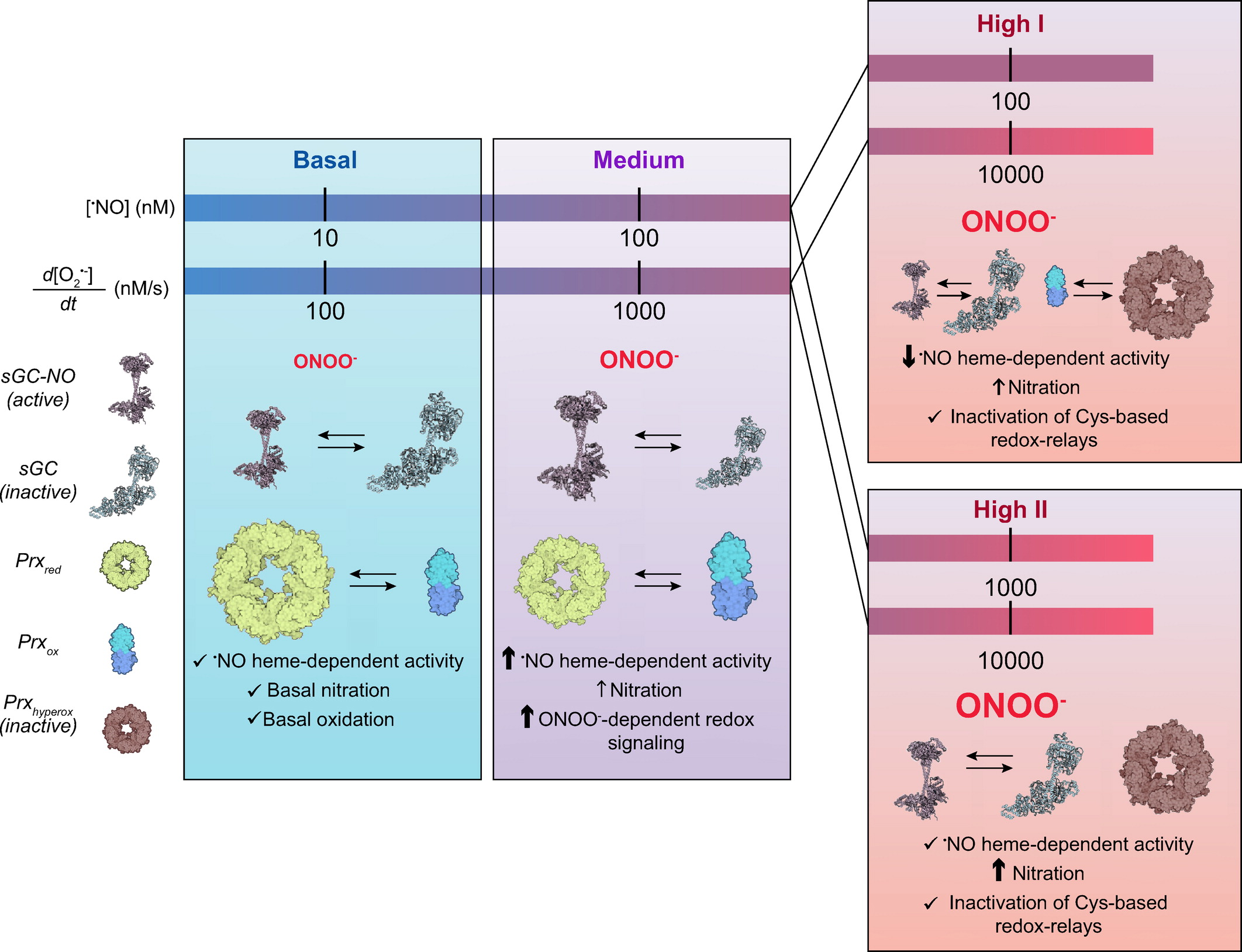 이 그림은 -NO와 O2--가 동시에 생성되는 생물학적으로 관련된 다양한 조건을 살펴보고 -NO의 반감기와 그에 따른 ONOO-의 형성을 모두 제어할 수 있는 결과를 보여줍니다. 기저 조건(Basal) 하에서 낮은 농도의 -NO는 O2--의 항상성 플럭스(d[O2--]/dt)의 맥락에서 정상적인 생리학적 효과[예: 가용성 구닐레이트 시클라제(sGC)의 활성화]를 발휘하며, 이 조건은 주로 퍼옥시레독신(Prx)에 의해 산화되는 ONOO-를 낮은 수준으로 형성하여 목표 생체 분자에서 한계 수준의 산화적 변형을 남깁니다. NO 합성을 위한 더 강한 생리적 자극 조건(중간)에서는 헴 의존적 신호가 증가하고 -NO의 일부가 산화 환원 신호 작용을 발휘할 수 있는 수준까지 ONOO-로 진화합니다. 이 처음 두 상황은 생리적 조건에서 작동하며 정상적인 노화 과정과 연관된 것으로 간주할 수도 있습니다. 그러나 정상적인 -NO 출력 조건에서 O2-- 플럭스가 크게 증가하면(예: NADPH-산화효소 활성화, 이종 생물학적 산화 환원 순환, 미토콘드리아 대사 장애, 높은 I), 추정 “스위치”가 완전히 작동하여 -NO 매개 가역적 신호가 “꺼지고” 동시에 퍼옥시니트라이트가 매개하는 본격적인 산화 생화학이 “켜지는”(예: Cys 기반 산화 환원 릴레이의 비활성화) 것으로 간주됩니다. 마지막으로, -NO와 O2--가 동시에 높은 수준으로 생성되는 시나리오에서[예: 염증 중 유도성 산화질소 합성효소(iNOS) 유도 및 NADPH-산화효소 과활성화, 높음 II], -NO 신호는 둔화되지 않을 수 있지만(심지어 과도할 수도 있음), 큰 ONOO- 수준이 동시에 형성되어 심각한 산화적 변형과 손상을 초래할 수 있습니다. 마지막 두 가지 생화학적 조건은 각각 고혈압과 염증과 같은 병리학적으로 관련된 상황에 적용되며, 다른 여러 질병 조건에서 -NO, O2-- 및 ONOO- 상호 작용의 영향을 합리화하는 데 도움이 됩니다. 따라서 엄밀히 말하면, -NO 및 O2-- 반응이 헴 의존성 -NO 매개 신호의 “오프”와 질산화 및 Prx 산화 및 과산화를 포함하여 과산화 아질산염이 매개하는 산화 반응의 “온”을 유발하는 명확한 스위치에는 특별한 조건만 적용됩니다.