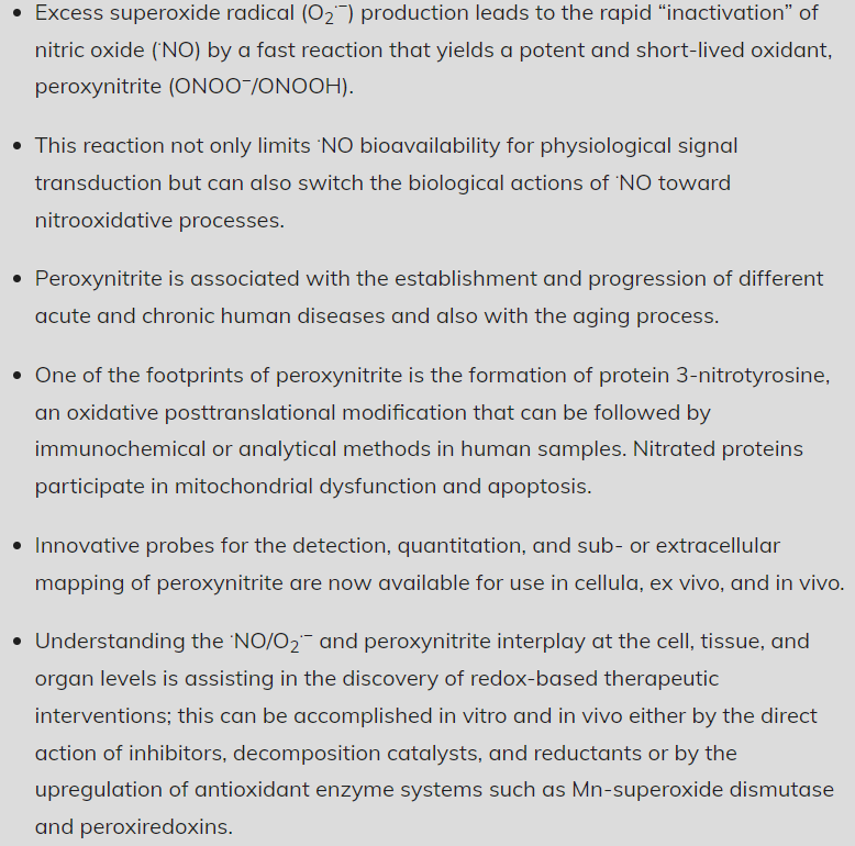 - Excess superoxide radical (O2--) 생성은 강력하고 수명이 짧은 산화제인 퍼옥시니트라이트(ONOO-/ONOOH)를 생성하는 빠른 반응에 의해 산화질소(-NO)를 빠르게 “비활성화”시킵니다.