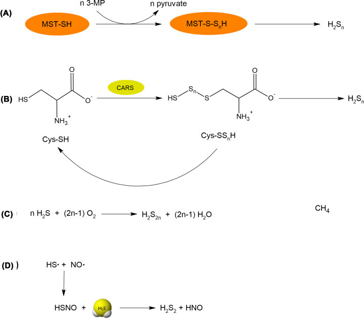 생물학적 시스템에서 RSS 작용의 가장 중요한 메커니즘 중 하나는 단백질의 과황화 작용과 관련이 있습니다. 이 반응은 단백질의 -SH 그룹이 설펜산 또는 S-니트로소티올로 가역적으로 산화될 때 H2S에 의해 촉발될 수 있습니다. 단백질의 -SH 그룹이 환원 상태에 있을 때, 과황화물 또는 폴리황화물만이 표적 단백질을 황화할 수 있습니다. 과황화물과 폴리황화물이 H2S보다 더 효율적인 과황화제로 간주된다고 가정합니다. 앞서 언급한 바와 같이, 과황화물은 H2S보다 더 활동적이고 안전한 황 종류이기 때문에 황 산화 환원 신호 전달에 적합한 후보입니다. 그러나, 과황화물의 안정성이 낮기 때문에 생물학적 응용에 직접 사용하는 것이 쉽지 않습니다. 따라서, 생물학적 시스템에 사용하기 적합한 과황화물 공여체를 만들기 위한 노력이 이루어졌습니다.