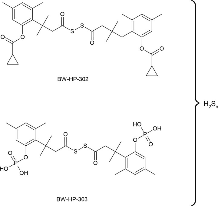 Like in the case of H2S, persulfides and polysulfides, slow and controllable donors of inorganic polysulfides (H2Sn) are looked for but this area is not well explored. Yu et al. developed esterase- and phosphatase-sensitive H2S2 prodrugs with tenable release rates, termed BW-HP-302 and BW-HP-303, respectively (Figure 15). The utility of these compounds in RSS donating was confirmed by S-persulfidation of glyceraldehyde 3-phosphate dehydrogenase (GAPDH) [205]. H2Sn donors, like BW-HP compounds, are based on the template of highly reactive acyl disulfide, they can form polysulfides and release H2S under the influence of thiols [206]. Acyl disulfides can also react with nucleophiles, like amines, which suggests that these H2Sn donors in biological systems may react with naturally existing molecules, like amino acids [102]. Recently, Xu et al. demonstrated that diacyl disulfides could produce H2S2 in reaction with various nucleophiles including amines in both aqueous and organic environment [206].