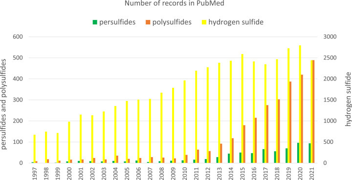 Figure 1. The number of records in PubMed obtained by searching the database for RSS that included H2S (yellow), persulfides (green) and polysulfides (brown) published over the last 25 years.