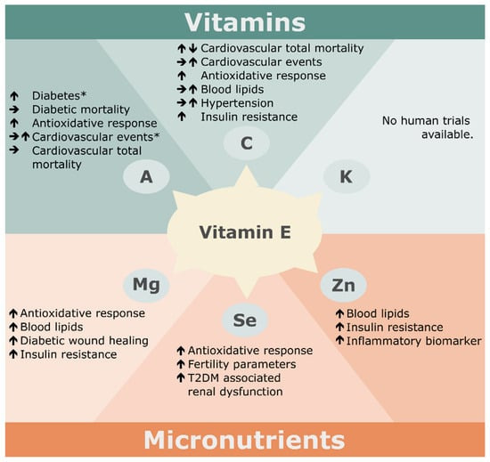 Figure 2. Impact of the dietary intake or the supplementation of vitamin E and other micronutrients including vitamins A (including β-carotene), C, and K, as well as zinc, magnesium, and selenium, on metabolic diseases. ↑, improved parameter after co-supplementation; ↓, deteriorated parameter after co-supplementation; →/↑, controversial results found in different trials; *, correlation shown by observational studies. Abbreviation: T2DM, diabetes mellitus type 2.