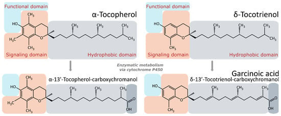 As shown in Figure 3, α-TOH, α-13’-COOH, and garcinoic acid have similar molecular structures. Structure–activity relationship studies indicate that three main structural features in the vitamin E analogues play pivotal roles for different biological functions and the intensity of the functions is also modulated by the modifications of these domains [199,200,201]: (i) The hydroxyl group on the C6-position of the chromanol ring is indispensable for the antioxidant activity [199]. (ii) The signaling domain is involved in the activation of signaling pathways regulating inflammation and cytotoxicity [201]. The hydrophobic side-chain contributes to the distribution in membranes and lipoproteins [199]. Furthermore, several structural factors of the side-chain such as the number of carbon units, existence of double bonds, methylation pattern of the chromanol system and the oxidized modification at the end of the side-chain, have been considered to affect the effect of the molecules (reviewed in [201]).