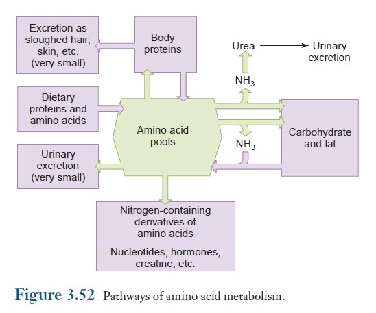 위 그림은 신체가 아미노산을 다루는 여러경로를 요약한 것이다. 신체 전체의 자유아미노산으로 이루어진 아미노산 풀(pool)은 1) 섭취한 단백질로서 창자에서 소화되는 동안 아미노산으로 분해되는 것들 2) 탄수화물과 지방으로부터 유래된 케토산으로부터 비필수 아미노산들의 합성 3) 신체구성 단백질들의 끊임없는 분해 등으로 이루어져 있다. 이들 풀은 신체구성의 단백질 합성, 특수 아미노산 유도체로 쓰일 뿐 아니라 탄수화물과 지방으로도 계속 전환될 아미노산들을 제공한다. 신체는 오줌, 털, 피부, 손톱, 월경 등에 의해 즉은 양의 단백질과 아미노산을 잃는다. 아미노산을 잃는 주요 경로는 이처럼외부로부터 유출되는 것보다 오줌의 요소처럼 궁극적으로 질소원소를 배출하는 탈아미노반응에 의해서이다.