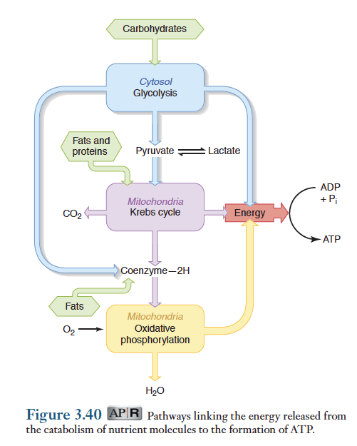 세가지 연료분자(탄수화물, 지방, 단백질)가 어떻게 ATP를 생성하는 과정들로 진입해 들어가는지 알아보자. 우리는 또한 이러한 연료분자들의 합성 그리고 하나의 물질에서 다른 부류의 물질로 바뀌는 경로와 제한성들을 알아볼 것이다. 이들 합성경로는 또한 에너지의 저장과 방출 외 다른 기능을 가지는 분자들을 합성하는데도 사용되어진다. 예를들어 몇몇 효소의 첨가로, 지방합성을 위한 경로는 세포막의 구성 성분인 인지질들의 합성을 위해서도 사용될 수 있다. 이 절에서 제공되는 정보들은 신체가 요구하는 것과 수시로 변하는 연료분자들이 어떻게 서로 맞추어 나가는가를 이해하는데 기본으로 삼아야 한다. 식욕, 음식의 소화와 흡수, 혈액을 이용한 흡수연료 분자들의 수송, 세포막을 통과하는 수송, 그리고 굶주림과 기아 등에 대한 신체의 반응을 조절하는 생리적 기작은 15장과 16장에서 다룸.