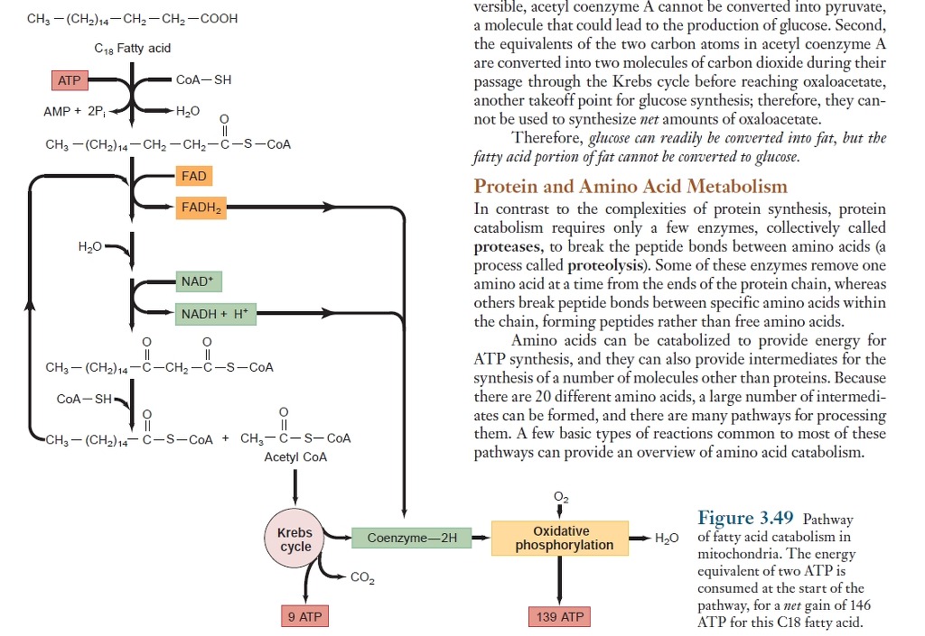 지방산 한분자를 완전히 분해하면 몇개의 ATP가 만들질 수 있을까? 체내에서 대부분의 지방산은 14개에서 22개의 탄소를 갖고 있고, 이 중에서 16개짜리와 18개짜리가 가장 흔하다. 탄소 18개를 갖고 있는 한분자의 포화지방산이 분해되면 146개의 ATP분자가 만들어진다. 반면 우리가 방금 공부한대로 1개의 포도당 분자가 분해되면 최대 38개의 ATP 분자가 만들어진다. 따라서 지방산과 포도당의 분자량 차이를 고려해서 지방 1g을 분해하여 만들어진 ATP는 탄수화물 1g을 분해할때에 비해 2.5배 정도 더 많은 양을 생성한다.