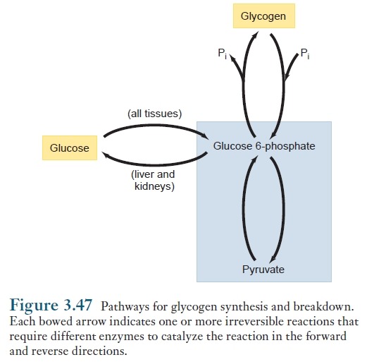 적은 양의 포도당은 음식으로부터 혈액으로 흡수되지 못할 경우를 대비하여 신체 내에 저장될 수 있음. 제 2장에서 언급한 골격근과 간에 저장되어 있는 글리코겐이라는 다당류를 기억해보라. 글리코겐은 그림 3-47에 나타낸 것과 같은 경로에 의해 포도당으로부터 만들어진다. 글리코겐의 합성과 분해를 위한 모든 효소들은 세포기질에 있다. 글리코겐 합성의 첫 단계는 한분자의 ATP로부터 인산기를 포도당으로 옮겨 포도당 6-인산을 만드는 것인데, 이것이 해당과정의 첫단계와 똑같다. 따라서 포도당 6-인산은 피루부산으로 분해될 수 있고, 클리코겐으로 합성될 수 있다. 그림 3-47에 나타난 것처럼 글리코겐을 합성하거나 분해하기 위해 서로 다른 효소들이 사용되고 있음을 주시하라. 공유결합이나 다른자리 입체성조절을 통하여 조절받는 효소들이 포함된 2개의 경로는 포도당과 글리코겐 사이의 흐름을 조절하는 기전을 제공한다. 간이나 골격근에 포도당이 존재하면 글리코겐 합성에 관여하는 효소들은 억제된다. 이런 조합을 통해 글리코겐 형탤 포도당을 저장할 수있게 되는 것이다.