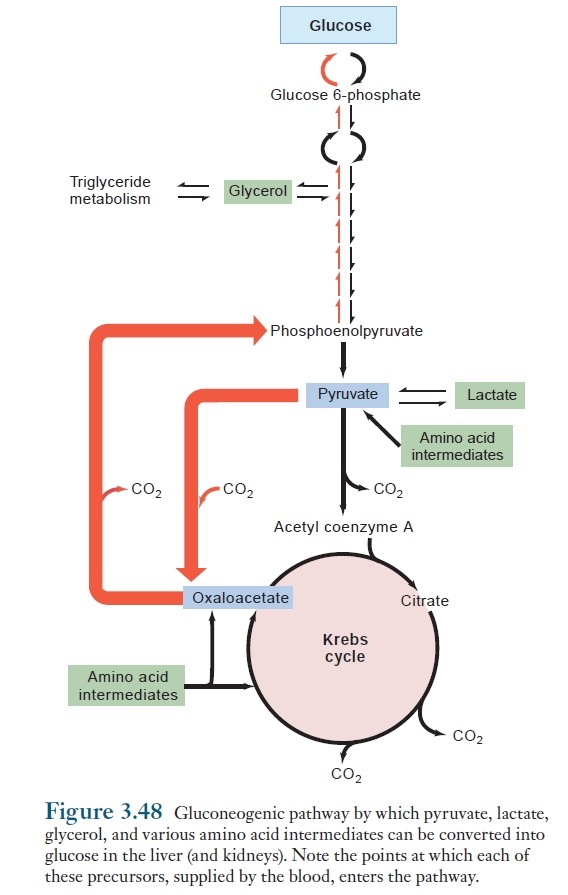 간과 신장에서 포도당 신생의 경로 그림 3-48은 해당과정의 반응이 가역적이기 때문에 피루브산에서 포도당을 합성하기 위해 또 다른 효소를 필요로 한다. 피루브산에 이산화탄소가 첨가되어 크렙스 회로에 있는 4개의 탄소로 이루어진 옥살로아세트산이 만들어짐에 따라 피루브산은 미토콘드리아내의 반응들에 의해 포스포에놀피루브산으로 전환된다. 몇가지 반응이 더 관여, 옥살로아세트산으로부터 유래된 탄소 4개짜리 중간체 물질을 미토콘드리아에서 끄집어 내어 세포질에서 포스포에놀피루브산으로 전환하는 것이다. 포스포에놀피루브산은 해당과정의 각 단계를 거슬러 해당과정 세번재 반응까지 올라간다. 이 세번째 반응에서는 해당과정에서 사용한 효소와 다른 효소가 과단 1,6-2인산을 과당 6-인산으로 변환시키는데 사용된다. 이후의 반응들은 다시 가역적이어서 포도당 6-인산으로 바뀌고, 이것은 간과 신장에서 포도당으로 전환되거나 글리코겐으로 저장된다. 포도당이 해당과정에 의해 피루브산으로 분해될때는 열이라는 형태와 ATP생성으로 에너지가 방출되지만 이 경로를 뒤집을 경우에는 에너지가 첨가되어야 한다. 포도당 신합성 반응들을 통하여 포도당 1분자를 만들면서 총 6분자의 ATP가 소모된다.