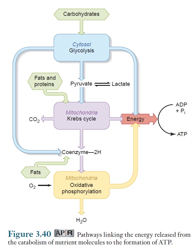 이 에너지의 약 40%가 ATP로 전환된다. 그림 3-46은 포도당이 이화작용을 거치는 동안 ATP가 만들어지는 장소를 요악하여 보여준 것이다. 2개의 ATP는 해당과정 동안 기질수준 인산화반응에 의해 만들어지고, 2개의 ATP는 크렙스 회로에 진입하는 2개의 피루브산 각각에서 만들어진 GPT에서 생성된 것이다. 포도당이 이화작용으로 만들어지는 전체 ATP들 중 대부분 즉 포도당이 이화작용으로 만들어지는 전체 ATP 들 중 대부분 즉 포도당 한분자당 34분자의 ATP를 만들어내는 곳은 포도당 분해과정 중 여러곳에서 생성된 수소를 이용하는 산화적 인산화반응이다.