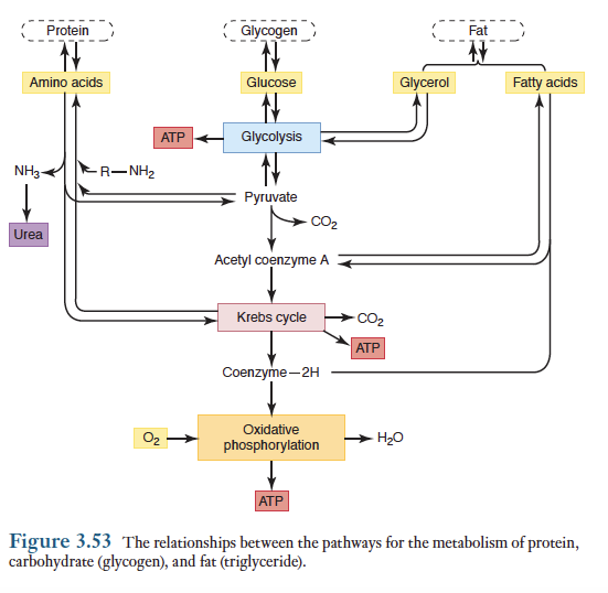 그림은 우리가 방금 논의한 주요 경로들과 일반 중간체 물질들 사이의 관계를 보여주고 있다. 세가지 모든 유기분자들은 몇가지 중간체 물질을 통해 크렙스 회로에 진입할 수 있으며 따라서 이들 모두는 ATP 합성을 위한 에너지원으로 사용될 수 있다. 포도당은 피루브산, 올살로아세트산, 아세틸조효소 A와 같은 일반 중간체 물질을 통해 지방 혹은 아미노산으로 전환될 수 있다. 비슷하게 몇몇 아미노산들도 포도당과 지방으로 전환될 수 있다. 그러나 피루브산이 아세틸조효소A로 바뀌는 반응이 비가역적이어서 지방산은 포도당으로 전환될 수 없고, 대신 중성지방의 글리세롤 부분은 포도당으로 전환될 수 있다. 지방산은 몇몇 아미노산을 만들기 위해 케토산류의 분자들이 필요에 따라 에너지를 공급하기 위해 사용될 수도 있고, 다른 모든 분자는 아니지만 대부분은 합성할 수 있는 원료물질을 제공할 수도 있는 고도로 연계되어 있는 종합적 과정이다.
