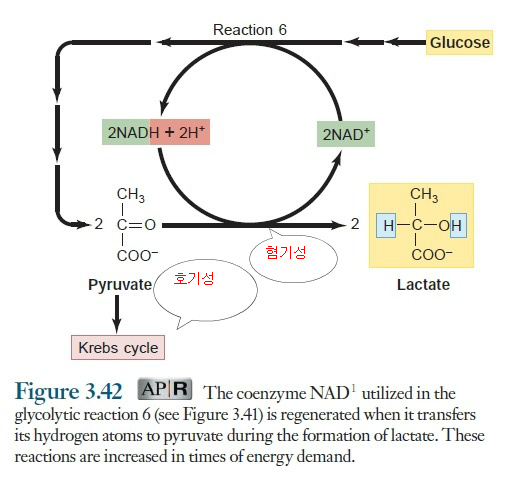바로 전에 얘기한대로 산소가 존재하는 조건에서는 피루브산이 젖산으로 전환되지 않고 오히려 크렙스 회로로 들어간다. 따라서 젖산을 형성하기 위해 NADH+H+에서 NAD+를 재생하는 일은 일어나지 않는다. NADH에서 나온 수소는 산화적 인산화동안 NAD+와 물분자를 생성하면서 산소에 전달된다.