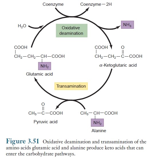 위 그림은 글루탐산이라는 아미노산의 탈아미노반응과 알라닌이라는 아미노산의 아미노기전달반응을 보여주고 있다. 여기서 만들어진 케노산들은 크렙스 회로에 있거나, 해당과정에 있는(피루브산) 중간체 물질일 수 있음을 주시하라. 한번 만들어지면 이들 케토산들은 이산화탄소를 만들기 위해 그리고 ATP를 만들기 위해 대사될 수 있으며 아니면 포도당을 만드는 합성경로의 중간체물질로 사용될 수 있다. 세번째 대안으로 그들은 피루브산을 거쳐 아세틸조효소A로 변환된 후 지방산을 합성하는데, 사용될 수 있다. 그러므로 아미노산들은 에너지를 생산하는데 사용될 수도 있고, 어떤 것들은 탄수화물이나 지방으로 전환될 수 있다.
