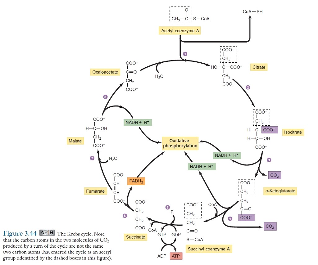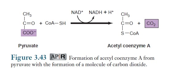 이 반응은 연료분자의 분해과정 동안 처음으로 이산화탄소를 생성하고 있으며 또한 수소원자를 NAD+에 이동하고 있음을 알아야 한다. 크렙스 회로는 아세틸조효소 A의 아세틸기를 4개의 탄소를 갖는 옥살로아세트산으로 옮겨 6개의 탄소를 갖는 시트르산을 만드는 것으로 시작한다. 이 회로의 세번째 반응과 네번째 반응에서 각기 이산화탄소가 생성된다. 따라서 조효소 A에 붙어있는 아세틸기의 구성성분으로 참여한 2개의 탄소는 이산화탄소 형태로 떨어져 나간다. 또한 이산화탄소에 존재하는 산소는 산소분자로부터 유래된 것이 아니고 크렙스 회로 중간체 물질의 카르복실기에서 비롯된 것임을 알아야 한다.