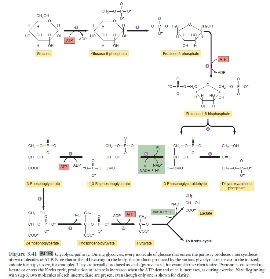 산소분자를 전혀 이용하지 않는 이들 10가지 반응은 세포질에서 일어난다. 포도당과 마지막 생성물인 피루브산 사이의 모든 중간체들은 하나 또는 그 이상의 이온화된 인산기를 가지고 있음에 주목하자. 원형질막은 이렇게 이온화된 분자들에 대해서 전혀 투과성이 없기 때문에 이들은 세포내에 갖혀있음.
