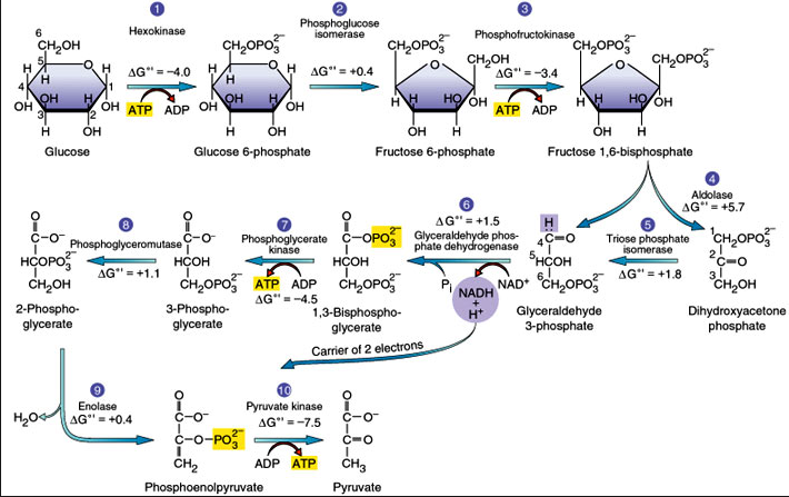 해당과정은 6개의 탄소원자로 이루어진 포도당 한분자를 3개의 탄소원자로 이루어진 2개의 이온화된 형태인 피부르산 분자로 전환하는 10가지 효소반응으로 구성. 이 반응은 두분자의 ATP, NDA+로 이동된 2개의 수소원자, 수소이온으로 방출된 2개의 원자 총 4개의 수소원자를 생성