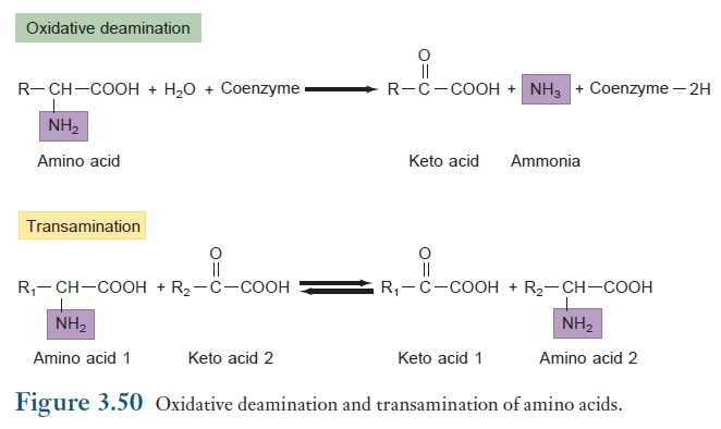위 그림은 아미노기가 제고되는 두가지 유형의 반응들을 보여주고 있다. 첫번째 반응이 산화적 탈아미노반응(Oxidative deamination) 에서 아미노기는 1개의 암모니아(NH3)분자를 방출하며, 특정분자의 이름이 아니라 일종의 카테고리를 보여주는 이름인 케톤산을 만들기 위해 물분자에서 가져온 산소원자로 재체된다. 아미노기를 제거하는 두번째 수단은 아미노기전달반응(Transamination)이라고 하는데, 한 아미노산의 아미노기를 다른 케토산으로 옮기는 것이다. 아미노기가 옮겨간 케톤산은 아미노산으로 되는 것을 주시하라. 세포들은 핵산에 있는 퓨린이나 피리미딘 염기처럼 다른 중요한 질소삼유 분자들을 만들기 위해 아미노산에 있는 질소를 이용할 수 있다.