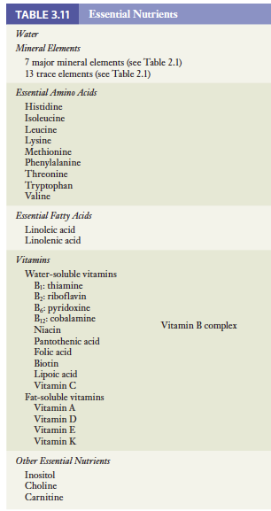 우리는 이미 20개의 아미노산들 중 9개의 필수아미노산임을 얘기하였다. 2개의 지방산인 리놀렌산과 리놀렌산은 여러개의 이중결합을 갖고 있으면서 화학적 신호전달체계에서 매우 중요한 역할을 하는 필수영양소이다. 세가지 추가적인 필수 영양분 즉 이노시톨, 콜린, 카르니틴은 뒤에 나올 여러장에서 설명되는 기능을 수행하지만 필수 영양소외의 다른 보통의 영역에 속하지 않는다. 마지막으로 비타민이라 알려진 필수 영양분의 영역은 특별한 주목을 받을만하다.