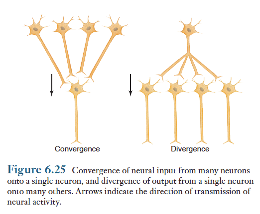 많은 시냅스전 세포로부터 수백 혹은 수천개의 시냅스가 하나의 시냅스 후 세포에 영향을 미칠 수 있으며(수렴, convergence), 하나의 시냅스 전 세포가 가지를 쳐서 많은 다른 시냅스 후 세포에 영향을 미칠 수도 있다(divergene, 발산). 수렴은 많은 세포로부터의 정보가 시냅스 후 세포에 영향을 미치도록 하며, 발산은 하나의 정보원이 다수의 경로에 영향을 미치도록 한다.