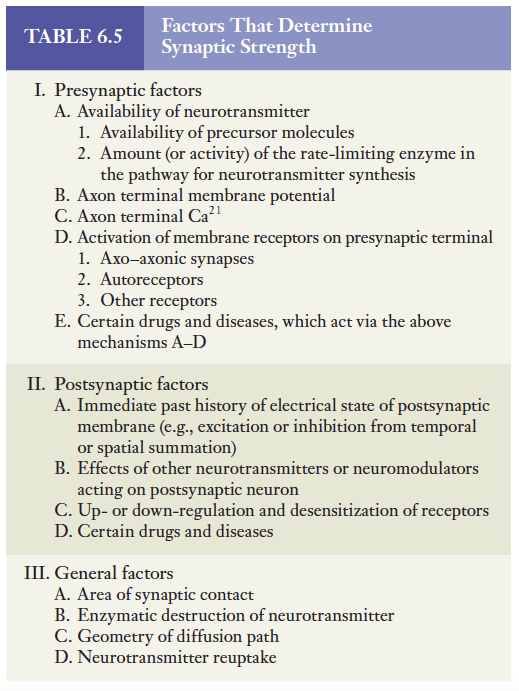 개별 시냅스의 활동은 그것이 흥분성이 되었든, 억제성이 되었든 마치 효과가 일정하고 재현이 가능한 것처럼 제시되었다. .. 주어진 시냅스의 효력 혹은 강도는 시냅스 전 기작과 시냅스 후 기작 모두에 의해서 영향을 받는다.