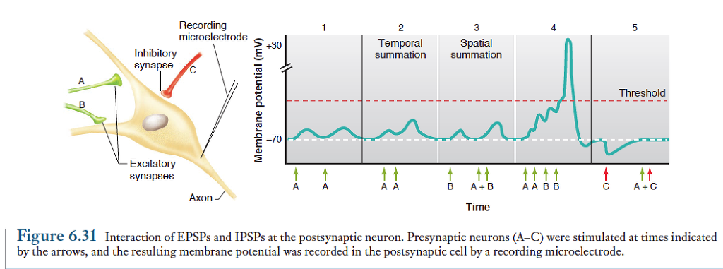 대부분의 뉴런에서 하나의 흥분성 시냅스 활성자체만으로 시냅스 후 뉴런의 역치에 도달시키기에는 충분하지 않다. 예를들어 하나의 EPSP는 단지 0.5mV인 반면에 뉴런의 막이 역치로 탈분극되기 위해서는 15mV 정도의 변화가 필요하다. 그래서 활동전위는 많은 흥분성 시냅스의 종합적인 효과에 의해서만 시작될 수 있다.