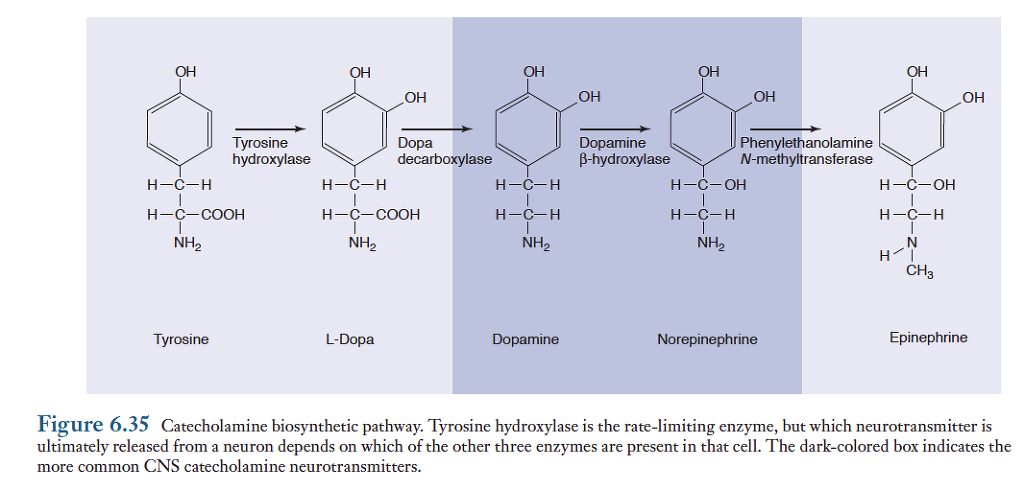 도파민, 노르에피네프린, 에피네프린 모두는 카테콜 고리구조(6개의 탄소로서 이루어진 고리 모양에 2개의 수산기가 붙어있는 구조)와 아민을 가지고 있어서 이들을 카테콜아민이라 부른다. 카테콜아민은 아미노산인 티로신으로부터 만들어지며 이들의 합성경로에서 첫 두번째까지는 서로 같은 과정을 공유한다. 그림 6-35참조