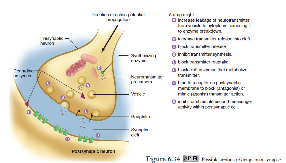 신경계에 작용하는 대다수의 약물은 시냅스 기작을 변경하여 시냅스 강도를 변화시켜 작용한다. 약물은 수용체 활성화 및 신경전달물질의 합성, 저장, 방출에 관여하는 신경의 정상적인 과정을 자극하거나 방해하여 작용한다.