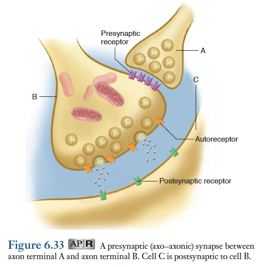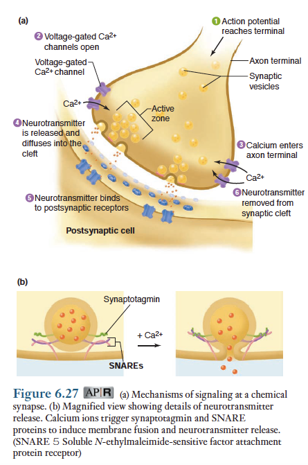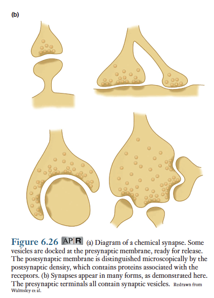 그림 6-26은 전형적인 화학적 시냅스(chemical synapse)의 구조를 보여주고 있다. 시냅스전 뉴런의 축삭은 약간 부풀어 올라 있는 축삭말단으로 끝이 나는데 신경전달물질을 함유하고 있는 시냅스 소포(synapse vesicle)가 이곳에 있다. 축삭 말단 바로 옆에 위치한 시냅스 후 뉴런의 막은 시냅스 후 밀도(postsynaptic density)라 불리는 특별한 부위를 형성하는 고밀도의 세포내부 및 세포외부 막단백질을 가지고 있다.