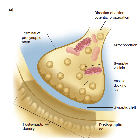 그림에서 보는 바와 같이 신경전달물질은 이중층 지질막으로 형성된 작은 소포에 저장되어 있다. 많은 소포는 활성화되기 이전에 활동영역(active zone)으로 알려진 방출부위에서 시냅스전 세포막에 결합되어 있는 반면 다른 소포들은 말단 내부에 퍼져있다. 신경전달물질의 방출은 활동전위가 시냅스전 막의 말단에 도달했을때 시작된다.