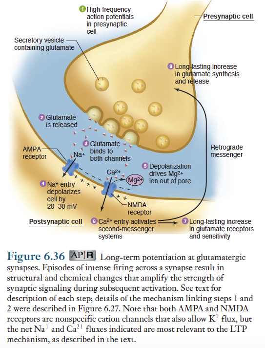 AMPA와 NMDA 수용체의 협동적 활성은 장기강화(long term potentiation)라 불리는 현상과 관련이 있다. 이 기전은 시냅스를 가로질러 자주 일어나는 활성과 이 시냅스를 통해 전달되는 신호전달 강도의 지속적인 변화를 병합시키는데, 그렇기 때문에 이것이 학습과 기억의 기초를 이루는 세포과정인 것으로 생각된다. ...