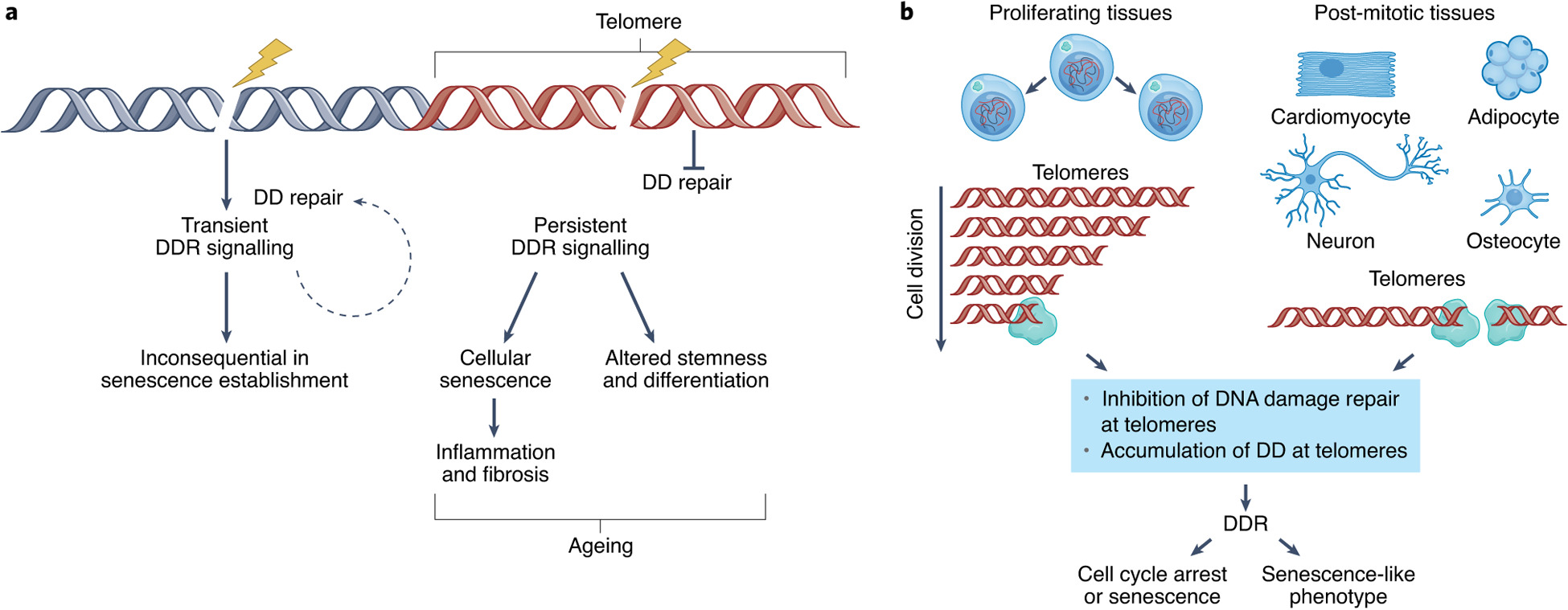 Telomeres erode with each cell division due to the biochemical nature of DNA replication: the use of RNA-based priming of the lagging strand and unidirectionality of DNA polymerases. Thus, telomeres have been proposed to be the “molecular clock” that determines the number of divisions a cell can undergo before reaching replicative senescence 2. Telomerase—an enzyme expressed in many human stem and cancer cells 3, as well as broadly in the mouse 4—adds telomeric DNA repeats to the telomere and is capable of conferring an indefinite division potential to several types of primary cells in culture, including fibroblasts 5. Without telomerase, telomeres become critically short and lose their protective function 6, which elicits a DNA damage response (DDR) that upregulates inhibitors of cell cycle progression to effect and enforce the senescence growth arrest 7.