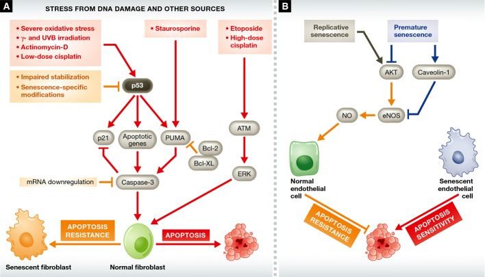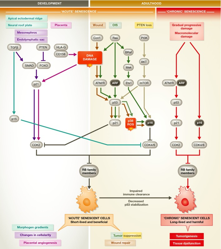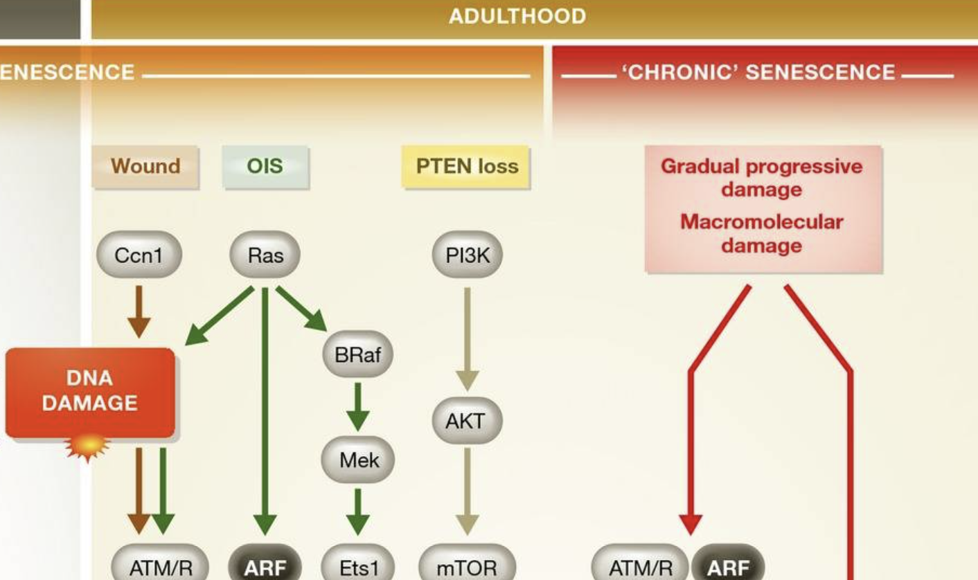 The concept of replicative senescence established a framework for understanding the signaling pathways that drive senescence. Damage sensor proteins, such as ATM in the replicative senescence of human cells, recognize a stress—for example short telomeres—and activate a master regulator (generally p53 through ATM-dependent phosphorylation), which in turn upregulates effectors of cell cycle arrest 8. p53 can also be stabilized through the action of p19Arf (p14Arf in human cells), an inhibitor of the ubiquitin ligase MDM2 that targets p53 for degradation. However, ATM can suppress ARF in some cancer cells, so the final effect on cell cycle progression depends on the balance between upstream signals 9.