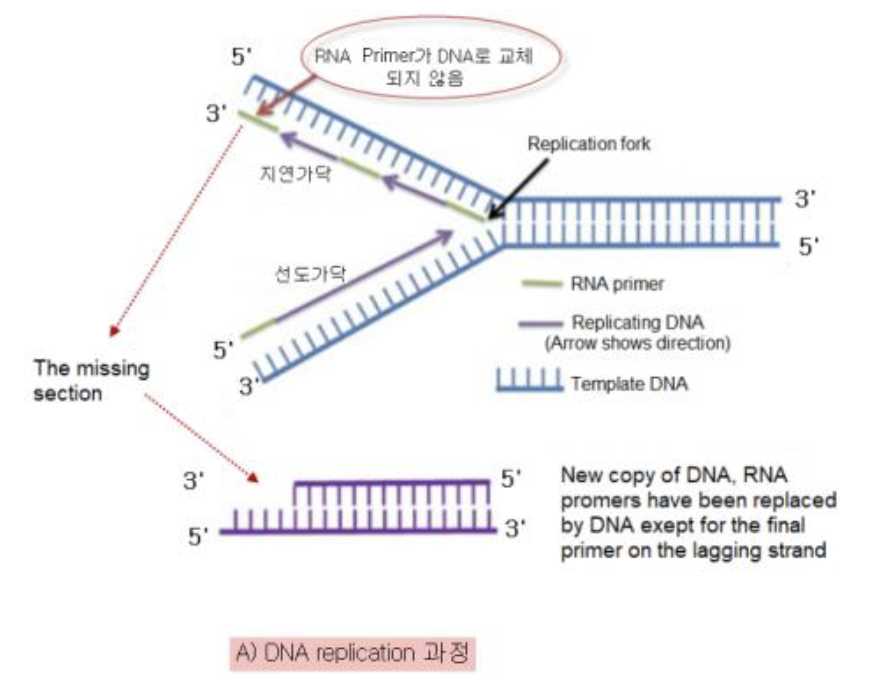 DNA 복제 과정에서 텔로미어는 복제될 때마다 조금씩 짧아져요. 이건 지연 가닥의 RNA 기반 프라이밍과 DNA 중합 효소의 단방향성 때문이죠. 세포 분열이 일어날 때마다 텔로미어가 점점 짧아지다가, 어느 순간 더 이상 짧아질 수 없게 되면 세포 분열이 멈추고 세포는 노화하게 돼요