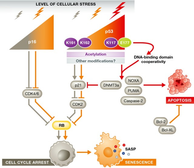 p21, a cyclin-dependent kinase inhibitor (CDKi) responsible for the initial cell cycle arrest, is one of the most important targets of p53 transcriptional activity in senescent cells. The p21-mediated cell cycle arrest can act as a temporary respite for cells with low to moderate amounts of damage, preventing S-phase entry under unfavorable conditions for DNA replication 10. If the damage is successfully repaired, cells may resume the transiently interrupted cell cycle. However, prolonged arrest leads to upregulation of the CDKi p16Ink4a 11, which activates the transcriptional regulator Rb. Prolonged p16Ink4a expression results in a permanent cell cycle arrest, often with a 2N G1 DNA content. Using the FUCCI reporter system to monitor cycle stages in live human cells, Nakanishi and colleagues recently found that senescence stimuli leading to a DDR can also result in “skipped” mitosis and a G1 arrest with 4N DNA content 12.