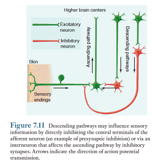 모든 감각 신호들은 중추신경계의 고위 수준에 도달하기 전에 거치는 감각경로상에 존재하는데 여러시냅스에서 광범위하게 변형된다. 측면억제처럼 다른 상행 뉴런과 인접함으로 인해 억제되기도 하고, 뇌의 고위 중추에서 내려오는 하행경로에 의하여 입수되는 정보의 상당부분이 감소되거나 제거된다. 특히 망상체와 대뇌피질은 하행경로를 통하여 구심성 정보의 입력을 조절한다. 억제성 조절은 일차 구심성 뉴런의 축삭말단에 직접 작용하거나(시냅스 전 억제), 또는 간접적으로 연합뉴런을 통해 감각경로의 뉴런에 영향을 줄 수 있다.