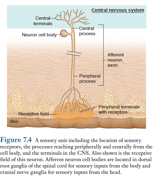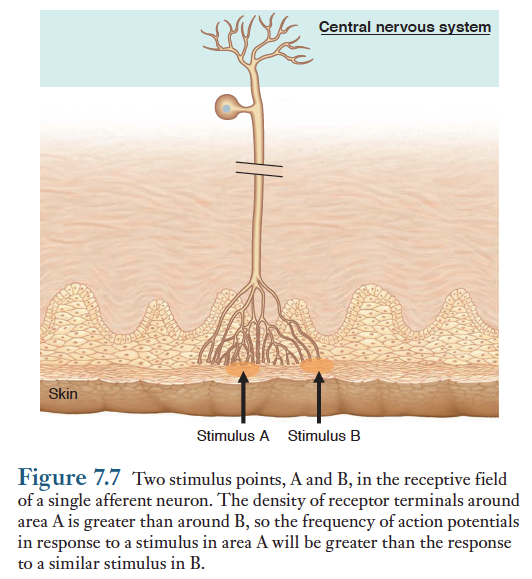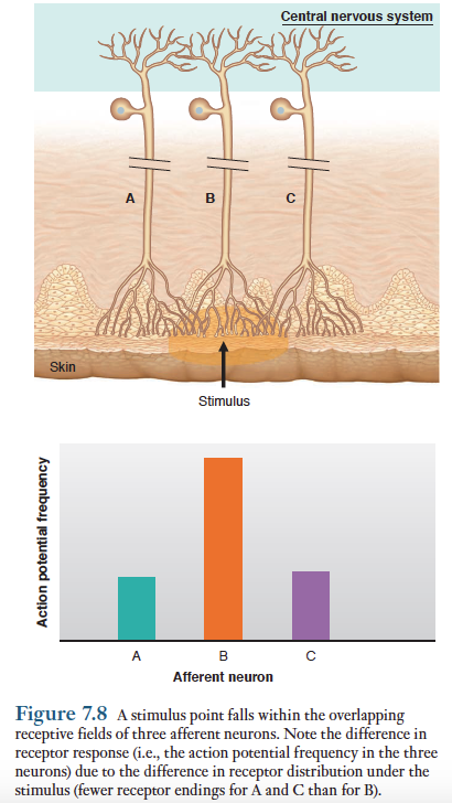 수용기 말단들을 가지고 있는 1개의 구심성 뉴런이 하나의 감각단위(sensory unit)를 형성한다. .. 자극에 대하여 특정한 구심성 뉴런의 활성을 유도하는 신체의 부위를 그 뉴런의 수용장(receptor field)이라고 한다. 이웃하는 구심성 뉴런들은 수용장을 일부 중복하여 공유하기 때문에 단 한지점을 자극하더라도 여러개의 감각단위들이 흥분한다. 따라서 1개의 감각뉴런만 흥분시키는 일은 일어나기 어렵다. 수용장이 중복되는 정도는 신체의 부위에 따라 다르다