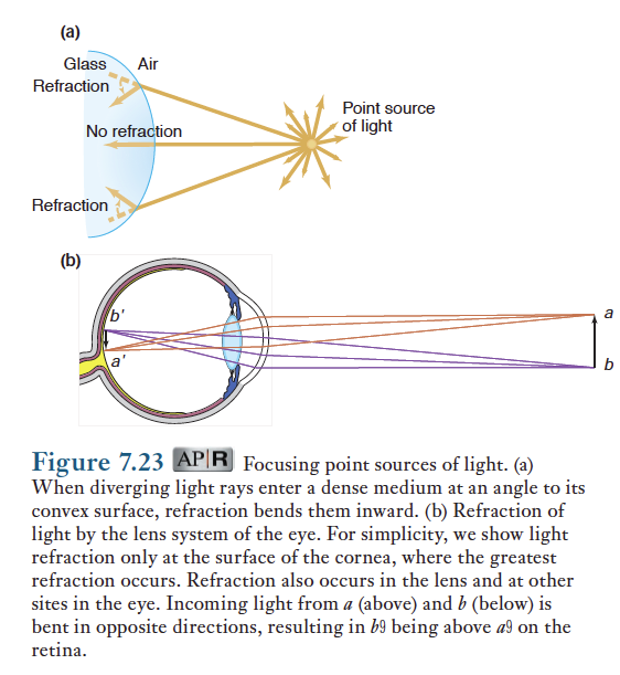 광선의 파장이 진행하는 방향에 따라 선으로 나타낼 수 있다. 광선은 빛을 발하는 사물로부터 온 사방으로 전파된다. 광선이 공기에서 밀도가 높은 매질(물)로 들어갈때 광선은 일정한 각도로 꺾이는데, 매질의 밀도와 표면에 부딪히는 각도에 의해 굽는 정도가 정해진다. 광선의 이러한 굽힘을 굴절이라 하고, 망막위에 사물의 영상에 대해 정확하게 초점을 맞추게 해주는 매커니즘이다.