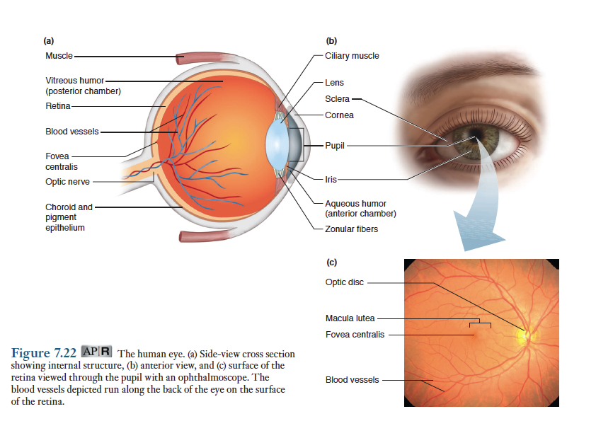 망막(retina) - 망막은 태아에서 발생중인 뇌조직의 연장이다. 눈의 뒷면에서 안쪽으로 펼쳐있는데 눈의 광수용기를 포함하여 많은 뉴런들이 들어있다.