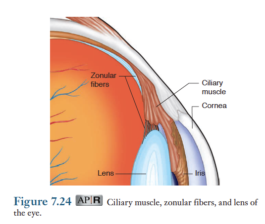 동공(pupil) - 홍채의 환상근과 방사근은 눈으로 빛을 통과시키는 구멍인 동공의 직경을 결정한다. 섬모체근(ciliary muscle)의 활동과 이로 인해 발생하는 소대섬유의 장력에 의해 홍채 바로 뒤에 있는 투명한 렌즈의 모양이 결정되며 초점 맞추는 일이 가능해진다.