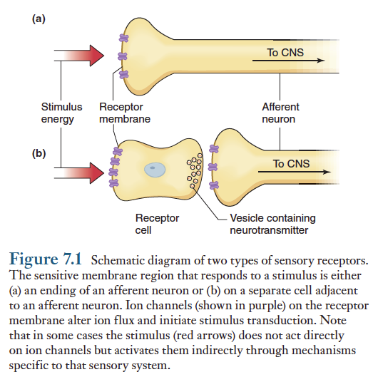 수용기는 1차 구심성 뉴런 자체의 끝이 특수하게 변형되거나(a), 또는 별개의 수용기세포로서 신경전달물질을 분비하여 1차구심성 뉴런을 자극하는 경우도 있다(b).