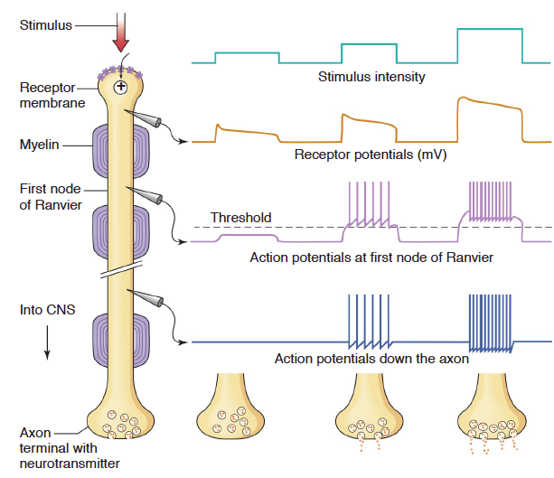 외부세계에 대한 정보나 신체 내부환경에 대한 정보는 서로 다른 형태의 압력, 온도, 빛, 냄새, 음파, 화학물의 농도 등의 형태로 존재한다. 구심성 뉴런의 말초끝에 있는 감각수용기는 이러한 정보들을 차등전위로 바꾸고 차등전위는 활동전위를 발생시키고, 활동전위는 중추신경계로 전달된다.