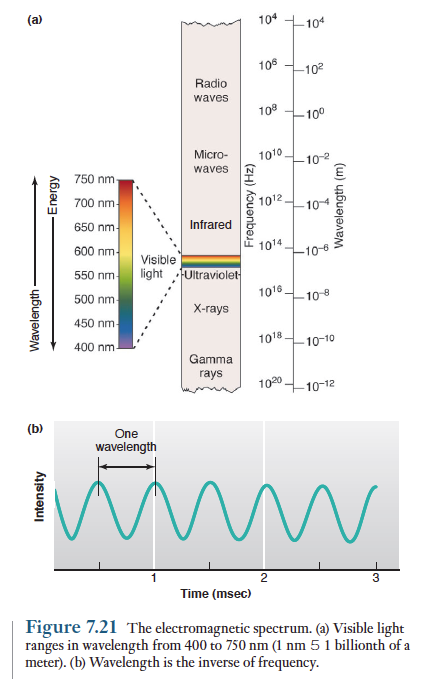 전자파 에너지는 파장과 주파수로 표현된다. 파장(Wavelength)은 전자파의 인접하는 파장 꼭지간의 거리를 말한다. 파장은 수킬로미터 장파장에서 나노미터 크기의 감마선에 이르기까지 다양하다. 전자파 주파수는 파장과 역비례 관계이다. 눈에 있는 수용기를 자극하는 가시광선 파장(visible spectrum)은 대략 400-750nm사이에 있다. 파장에 따라 다른 색으로 지각된다.