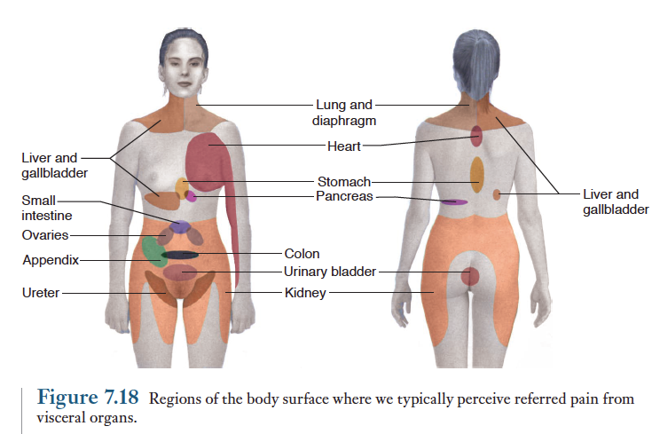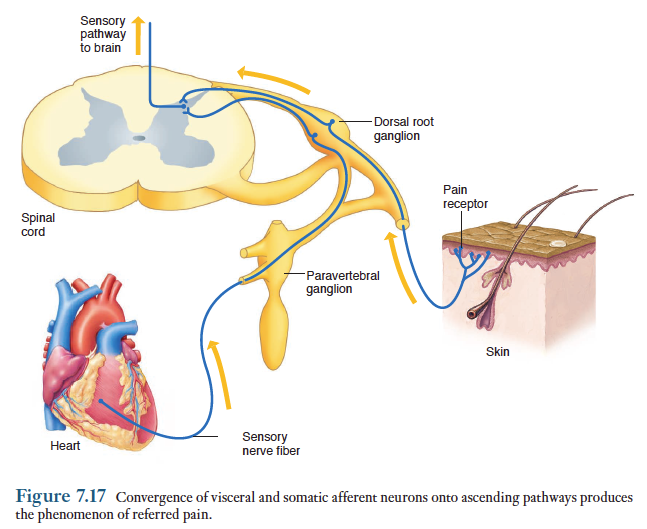 Referred pain(연관통)이란 손상당한 장소가 아닌 곳에서 통증을 느끼는 현상이다. 예를들어 심장마비가 일어날때 왼팔이 아프다는 것을 느끼게 된다. 연관통은 내장 구심성 뉴런과 체성 구심성 뉴런이 종종 척수에 잇는같은 뉴런에 수렴되는데서 그 이유를 찾을 수 있다. 체성감각섬유가 흥분되는 것이 보다 통상적이 구심성 발포이므로 내장통증이 일어나도 통증의 발원지를 체성 발원지와 연관시키게 된다.