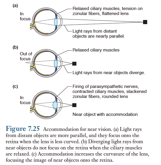 ..물체로부터 광선중에 눈과 가까운 것은 각막과 큰 각도를 이루면서 입사하므로 망막에 맺히기 위해서는 더 많이 굴절되어야 한다. 앞에서 보았듯이 망막에 상이 맺히는데 각막이 더 큰 역할을 하지만, 거리에 대한 보정은 렌즈의 모양 변화에 의해서 이루어진다. 이와같은 볂돠는 순응조절이라는 과정의 한부분이다.
