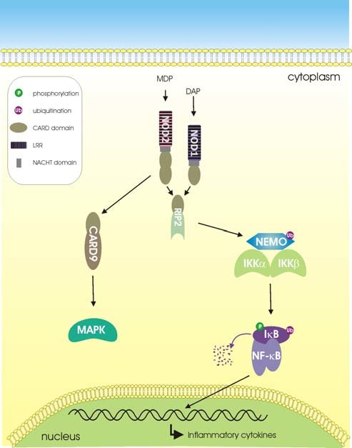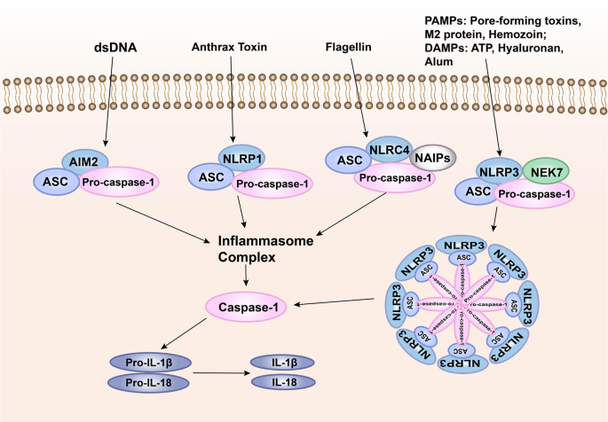 패턴 인식 수용체 매개 인플라마좀 신호전달. 병원성 미생물이 염증을 유도하는 한 가지 방법은 세포질 내 PRR에 의해 조립된 다중 단백질 복합체인 인플라마좀을 활성화하여 카스파제-1을 활성화하고, 이후 염증 유발 사이토카인인 IL-1β 및 IL-18의 활성화를 유도하는 것이다. 인플라마좀 복합체는 일반적으로 세포질 PRR, 어댑터 단백질(ASC), 프로카스파제-1을 포함한다. 각각 고유한 PRR과 활성화 유발 인자를 가진 다양한 인플라마좀 복합체가 발견되었다.