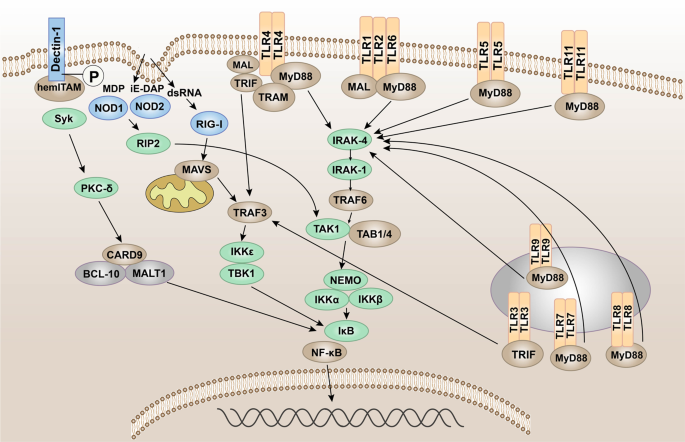 Human brain pericytes (HBPs) are an important component of the microvascular wall and contribute to the integrity of the blood–brain barrier (BBB).411 It has been found that TLR4 and NOD1 are expressed in HBP, which also reveals that HBP has the ability to sense systemic infection or blood-borne PAMPs. HBP can perceive Gram-negative bacteria to protect BBB through different pathways mediated by TLR4 and NOD1, or it can trigger paracrine signaling pathways by releasing chemokines and cytokines, leading to the destruction of BBB.412,413 These are all new insights that PRRs are involved in the body’s inflammatory response and may have an impact on the treatment of diseases.