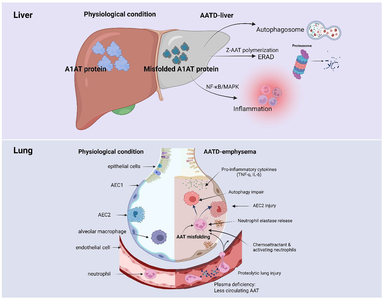 AATD 관련 간 및 폐 손상의 병리생리학적 기전. 생리적 조건에서 간은 정상적으로 접힌 알파-1 항트립신(A1AT) 단백질을 생성 및 분비합니다. 알파-1 항트립신 결핍증(AATD), 특히 Z 대립유전자(Z-AAT)로 인한 경우, 잘못 접힌 A1AT 단백질이 간세포에 축적됩니다. 이러한 잘못 접힌 단백질은 중합을 겪을 수 있으며, 소포체 관련 분해(ERAD) 및 자가포식(자가포식소체와 프로테아좀을 통해)을 통해 분해 대상으로 지정된다. 그러나 잘못 접힌 A1AT의 축적은 NF-κB 및 MAPK와 같은 염증 신호 경로의 활성화를 유발하여 간 염증 및 간 손상으로 이어질 수 있다. 반면, 하단 패널(폐)에서: 정상 조건에서 순환하는 A1AT는 폐포 구조를 보호하기 위해 호중구 엘라스테아제를 억제합니다. AATD 관련 폐기종에서는 기능적 A1AT의 결핍으로 호중구 엘라스테아제 억제력이 감소합니다. 이는 단백분해성 폐 손상의 증가로 이어집니다. 또한, 변형된 AAT와 혈장 결핍은 상피 세포(특히 폐포 상피 2형 세포, AEC2) 손상을 유발하고, 자가포식을 저해하며, TNF-α 및 IL-6과 같은 전염증성 사이토카인의 분비를 촉진합니다. 이러한 변화는 중성구를 추가로 모집 및 활성화시켜 염증과 폐 조직 파괴를 악화시킵니다.