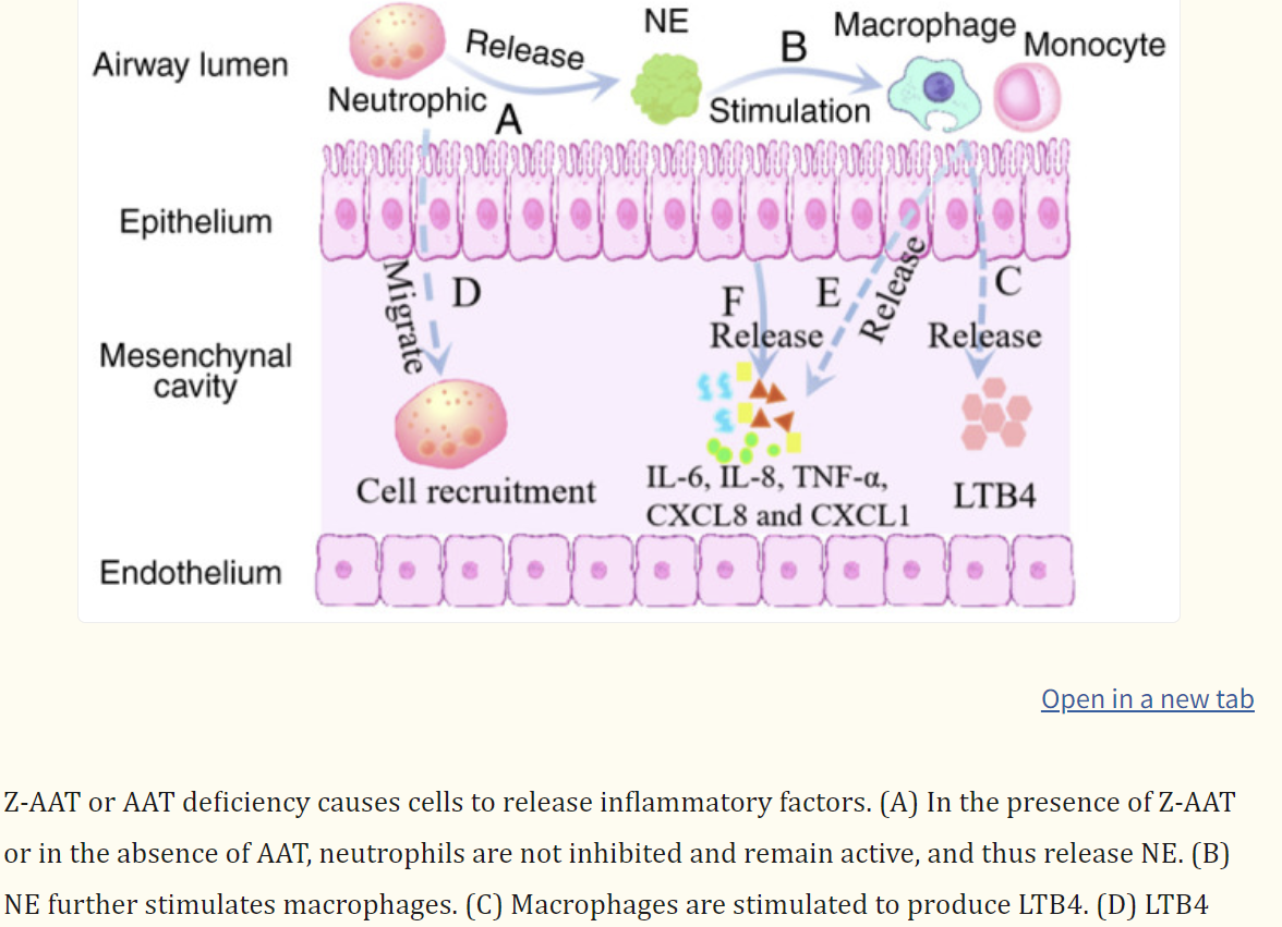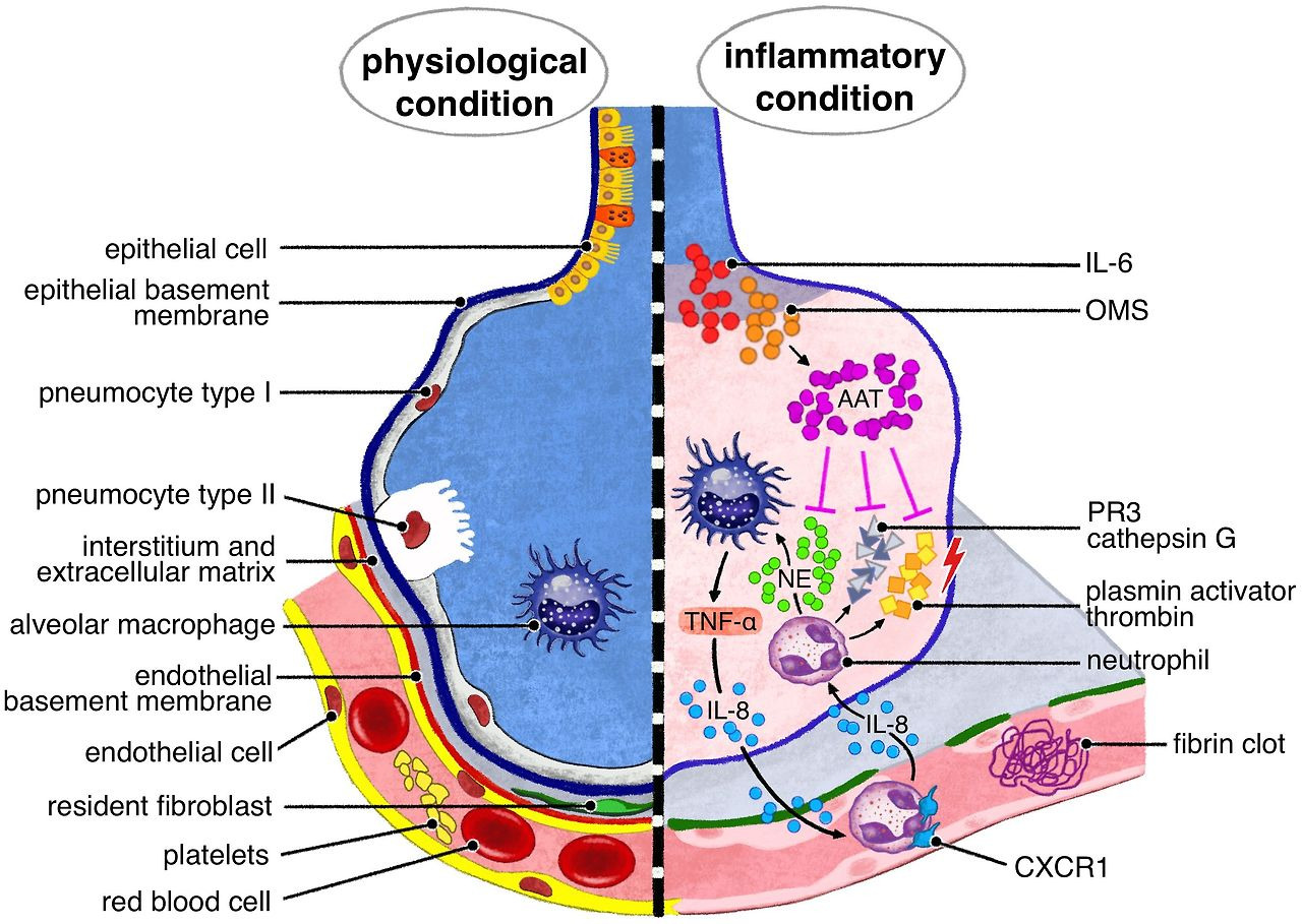 특히 중성구 엘라스테이스(NE)와 알파-1 안티트립신(A1AT)의 불균형을 주요 메커니즘으로 지적합니다.