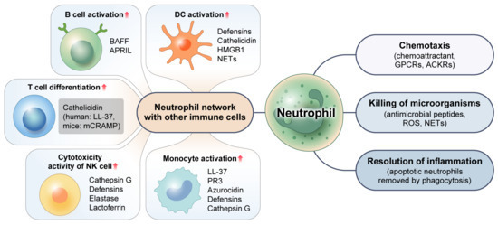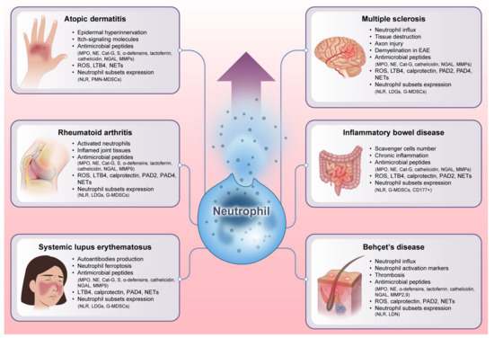 AD is a chronic inflammatory skin disease that causes extremely itchy redness and inflamed skin. The most preval‎ent feature of atopic diseases is immune globulin E (IgE)-mediated allergic reactions related to environmental allergens. AD is considered a heterogeneous disorder with a spectrum of morphology, dispersion, and disease progression. The pathophysiology is complicated, and numerous cell types are involved, including immune cells, skin cells, and neuronal cells that monitor and control immune responses [199,200]. Neutrophils are the initial immune cells that infiltrate AD skin. Moreover, neutrophils can regulate early skin hyperinnervation and upregulate the expression‎ of activity-induced genes and itch-signaling molecules in nerve cells [201,202]. These findings imply that neutrophils might influence AD onset and progression via a variety of mechanisms.
