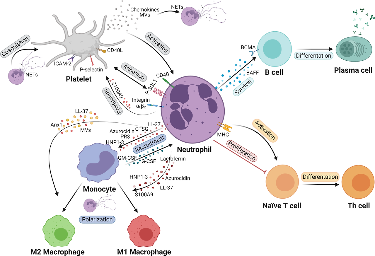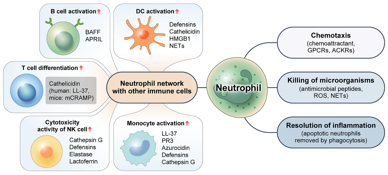 • DCs 활성화: 중성구는 DCs의 성숙과 항원 제시를 촉진하며, MHC II/CD40/CD86 발현을 조절합니다. NETs와 BAFF/APRIL 같은 요인은 DCs를 통해 T세포(특히 Th17)와 B세포 응답을 연결합니다.