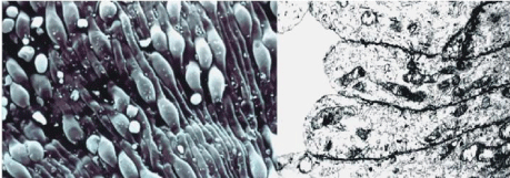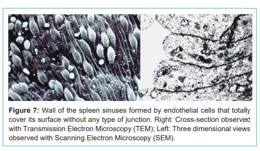 Figure 7: Wall of the spleen sinuses formed by endothelial cells that totally cover its surface without any type of junction. Right: Cross-section observed with Transmission Electron Microscopy (TEM); Left: Three dimensional views observed with Scanning Electron Microscopy (SEM).
